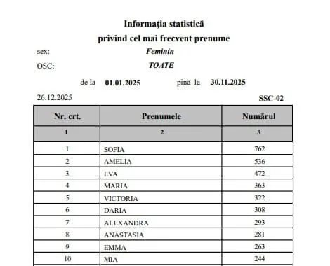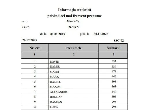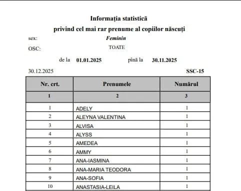 Cele mai rare nume ale anului 2025 în Moldova: De la Ammy la Amadeus Datele statistice din primele 11 luni ale anului, oferite de Agenția Servicii Publice (ASP) într-o solicitare adresată de Realitatea.md, arată că, în timp ce unii au mers pe variante clasice, alții au ales să fie surprinzător de ingenioși, scrie rupor.md.