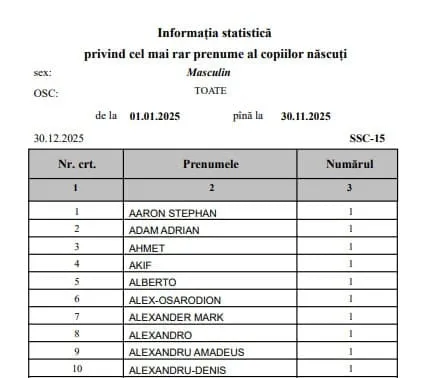 Pe lângă topurile de popularitate, statistica scoate la iveală și o categorie aparte: nume extrem de rare, atribuite o singură dată în toată țara.